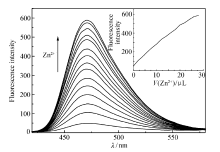 先向石英比色皿中加入2 mL的DMSO溶液,再加入20 μL配体L(5.0×10-3 mol/L)的DMSO溶液混匀,逐渐加入2 μL Zn2+,并测定每次加入后的荧光谱图。 在DMSO体系中,探针L的最大发射波长在472 nm处,随着Zn2+(5.0×10-3 mol/L)不断加入,荧光强度不断增加,并且最大发射光的波长移至470 nm处,在光诱导下螯合后的氮原子和氧原子与Zn2+之间的电子转移作用导致L的荧光增强[20]。图2为探针L(50 μL)在DMSO体系中随着Zn2+浓度增加的荧光光谱变化曲线。 右上角为锌离子用量与荧光强度的曲线图。