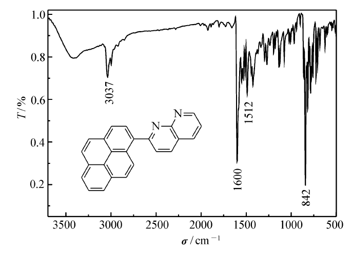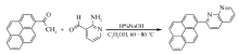在250 mL三口圆底烧瓶中依次加入0.61 g(2.5 mmol)1-乙酰基芘(AP)、0.31 g(2.5 mmol)2-氨基吡啶-3-甲醛和90 mL无水乙醇,待固体完全溶解后加入3 mL 10%NaOH溶液,磁力搅拌下加热到60~70 ℃反应5 h,反应期间TLC跟踪反应( V(乙酸乙酯):V(石油醚)=1:3)。 反应完成后,停止搅拌,冷却,抽滤,用少量无水乙醇洗涤滤饼2次,真空干燥,得黄色粉末固体0.66 g,产率80%;mp 209.3~209.8 ℃。 IR(KBr), σ/cm-1:3037.8,1600.8,1512.1,842.8;1H NMR(600 MHz,DMSO-d), δ:9.21~9.20(t,1H, J=3.0 Hz),8.73~8.72(d,1H, J=6.0 Hz),8.65~8.63(d,1H, J=12.0 Hz),8.58~8.57(d,1H, J=6.0 Hz),8.50~8.48(d,1H, J=12.0 Hz),8.41~8.36(m,3H),8.32(s,2H),8.27~8.26(d,1H, J=6.0 Hz),8.16~8.14(t,2H, J=6.0 Hz),7.76~7.74(q,1H, J=4.0 Hz);13C NMR(150 MHz,DMSO-d), δ:162.40,155.88,154.61,138.89,138.07,135.32,131.79,131.38,130.80,128.77,128.66,128.59,127.86,127.07,126.30,125.91,125.46,125.17,125.11,124.64,124.35,123.06,121.82;LC-MS(ESI) m/z实测值:331.10;计算值C24H15N2([M+H]+):331.12。