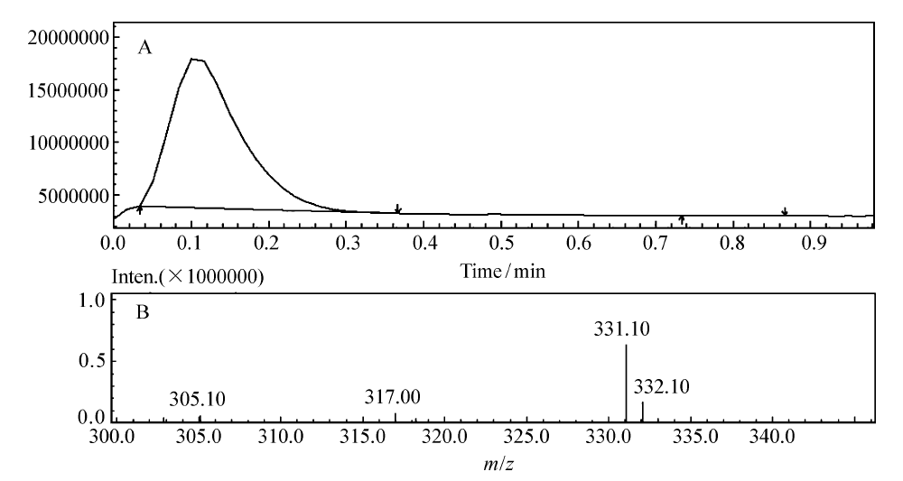 化合物PN的液相色谱和质谱如图4A和4B所示。 液相色谱(图4A)显示样品纯度很好;质谱(图4B)显示[M+H]+为331.10,与计算值(331.12)相差0.02,相对误差0.06‰,误差极小。 综合上述分析认为,合成的产物为PN,其结构正确。