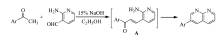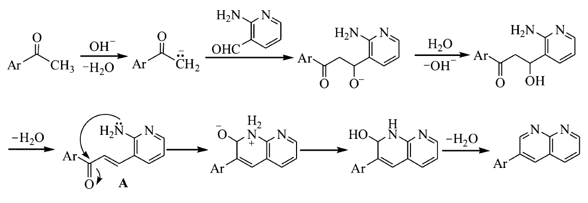 最初拟通过Claisen-Schmidt反应合成含芘查尔酮衍生物3-(2-氨基-吡啶-3-基)-1-(芘-1-基)丙烯酮,但结构表征给出的结果出乎预料,意外地生成了芘联萘啶类化合物2-(芘-1-基)-1,8-萘啶(图5)。 一般来说,氨及其衍生物与芳醛进行缩合反应需在酸催化下进行,酸的作用是增加羰基的反应活性,使其有利于被含氮亲核试剂进攻。 本反应是在碱催化下进行,之所以能够生成2-(芘-1-基)-1,8-萘啶,原因可能在于生成的产物结构是热力学稳定结构。 经讨论分析,认为该反应机理如图6所示(Ar表示芘基)。 首先,在碱作用下发生Claisen-Schmidt缩合反应形成查尔酮中间体。 接着,查尔酮中间体再进行分子内缩合反应,即羰基与氨及其衍生物的加成-消除反应,脱水后形成产物2-(芘-1-基)-1,8-萘啶。