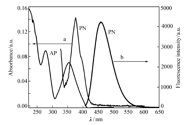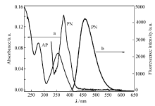 配制浓度为1.0×10-5 mol/L、1×10-6 mol/L的PN的二氯甲烷溶液,分别测定其紫外吸收光谱和荧光发射光谱以及原料乙酰芘AP的紫外吸收光谱(图7)。 由图7可知,PN的最大吸收波长为378 nm,摩尔消光系数1.43×104 L/(mol·cm),与原料AP的紫外最大(强)吸收波长(285 nm)相比,红移93 nm,且在450 nm以上无吸收。 从构效关系看,原料AP和2-氨基吡啶-3-甲醛在碱性条件下缩合生成含芘萘啶结构,形成了更大的 π电子共轭体系,更易发生 π-π*跃迁,使之在紫外光区域有较强的吸收带,并有较大红移。图7显示,PN的荧光最大发射波长为459 nm,荧光强度4240,表现出较强的荧光。