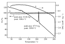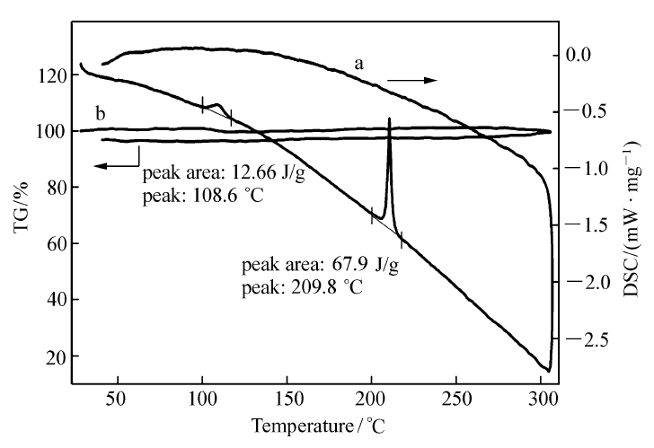 通过热分析仪测定了PN的热学性质,升温速率为10 ℃/min,温度范围为 25~300 ℃,测得的热重/差示扫描量热法(TG/DSC)曲线如图8所示。 PN的熔融峰209.8 ℃,熔融焓22.48 kJ/mol,该熔融峰值与所测熔点209.3~209.8 ℃基本一致。 108.6 ℃处出现1个小吸热峰,熔融焓4.19 kJ/mol,此峰应为不稳定晶型转变的固-固相变峰[14]。 TG曲线基本为一水平线,在25~300℃范围内升温过程中,PN并无明显质量损失,只在晶相转变时有微小热量变化,表现出良好的热稳定性。 这进一步证明,熔融峰209.8 ℃确为化合物的熔化过程,而非分解过程,因为化合物的分解过程一般伴随有质量损失。 综上所述,化合物PN在200 ℃之前不会熔化且无质量损失,可以满足在非线性光学材料应用中的一般要求。