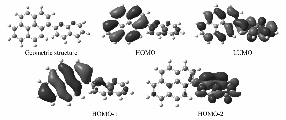 为了探索和理解分子结构和NLO性质之间的构效关系,采用Gaussian09程序[15],对1-(芘-1-基)-1,8-萘啶的几何结构、电子结构和自然轨道(NBO)等在B3LYP/6-311+G(d,p)[16,17]理论水平上进行了计算,图9给出了1-(芘-1-基)-1,8-萘啶分子的几何结构(Geometric structure)、最高占据分子轨道(HOMO)、最低空分子轨道(LUMO)的电子云结构图。