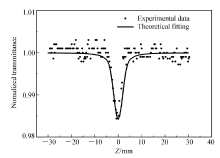 采用Z-扫描技术测定,选用可调谐激光器作为光源,激光脉冲180 fs,波长532 nm,样品浓度5.78 mmol/L的二甲基亚砜溶液(DMSO),重复频率10 Hz,实验获得了1-(芘-1-基)-1,8-萘啶的三阶非线性光学吸收曲线图(图10),通过数值拟合获得三阶非线性光学吸收系数 β=9.0×10-14 m/W。 1-(芘-1-基)-1,8-萘啶在上述条件下表现出反饱和吸收( β>0);在吸收过程中化合物表现出超快响应,意味着它的非线性响应的灵敏度较高;吸收系数与极化率具有一致性,即吸收系数大时对应的极化率也大。 从构效关系看,两个吡啶环相并形成的萘啶基作为电子受体和芘基相连形成了D-A型共轭结构,更有利于 π电子极化从而增大其反饱和吸收系数。