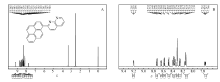 化合物PN的1H NMR谱图及其局部放大谱图如图2所示。图2A显示有14个芳香H质子种类和个数与目标化合物分子所含氢原子种类和个数相吻合。 从结构特点来说,萘啶结构由2个吡啶环稠合而成,电负性较大的氮原子使得萘啶环上氢原子的化学位移多数位于低场,而且比较密集。 9.21~9.20(t,1H, J=3.0 Hz)、8.73~8.72(d,1H, J=6.0 Hz)和7.76~7.74(q,1H, J=4.0 Hz)表示外侧吡啶环上的3个氢原子。 8.65~8.63(d,1H, J=12.0 Hz)和8.50~8.48(d,1H, J=12.0 Hz)表示内侧吡啶环上的2个氢原子。 8.58~8.57(d,1H, J=6.0 Hz)、8.41~8.36(m,3H)、8.32(s,2H)、8.27~8.26(d,1H, J=6.0 Hz)和8.16~8.14(t,2H, J=6.0 Hz)表示芘基上的9个氢原子,它们的化学位移因同属芘基而比较接近。