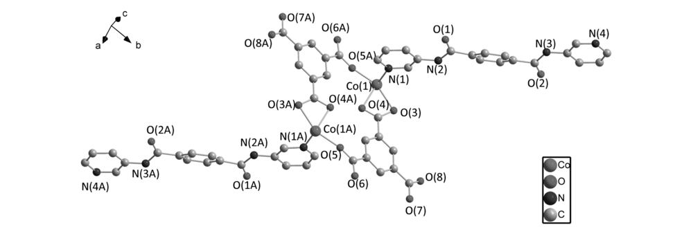 配合物1的结构属于三斜晶系,P-1空间群。 1,3,5-Hbtc2-共有两个羧基解离并与Co(Ⅱ)离子配位,其中1个羧基作为双齿配体与1个Co(Ⅱ)离子螯合配位(称为螯合配位的羧基),另一个羧基作为 μ2 -η1: η1型桥连配体以syn-syn模式与两个Co(Ⅱ)离子配位(称为桥连配位的羧基)。
