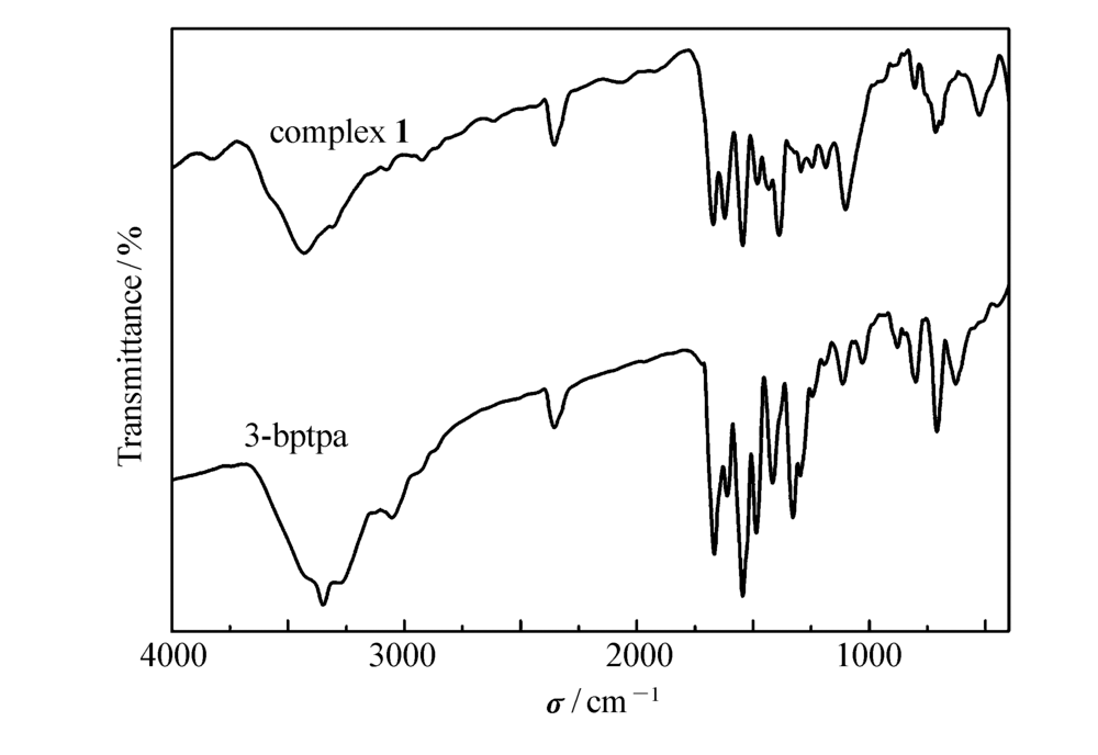 如图5所示,在室温下,在4000~400 cm-1范围内对配合物1进行固态红外光谱测试(KBr压片)。 在3436 cm-1附近的宽峰,归属为水分子和质子未解离的羧基中的羟基O—H及氨基N—H的伸缩振动[30],而且它们参与形成氢键。 在1679 cm-1处有宽且强的振动吸收,归属为未解离的羧基—COOH的伸缩和弯曲振动[13,31]。 螯合配位和双齿桥连配位的羧基的不对称伸缩振动分裂为1625和1545 cm-1两个吸收峰,1391 cm-1处的吸收峰归属为羧基的对称伸缩振动[32,33,34,35]。 吡啶环上C=N伸缩振动峰[36]也出现在1545 cm-1附近与羧基的不对称伸缩振动重叠[11],比自由配体3-bptpa中吡啶环的C=N伸缩振动吸收峰1482蓝移63 cm-1。 在528 cm-1附近的吸收归属为配位键Co(Ⅱ)—N的伸缩振动[37]。