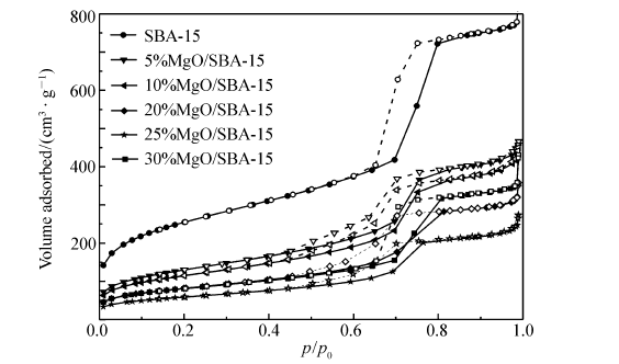 | 图1 不同MgO负载量的 wMgO/SBA-15催化剂样品N2吸附-脱附曲线Fig.1 N2 adsorption-desorption isotherms of wMgO/SBA-15 catalyst samples with different MgO loadings |