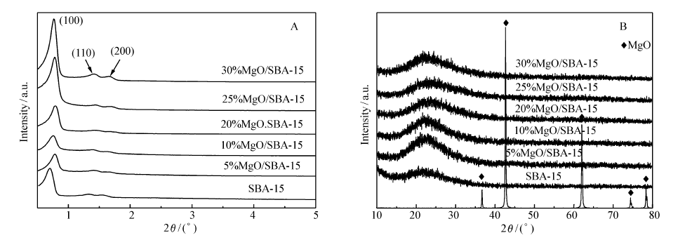 | 图2 不同MgO负载量 wMgO/SBA-15催化剂样品SAXS图(A)和广角XRD图(B)Fig.2 SAXS(A) and XRD(B) patterns for wMgO/SBA-15 catalyst samples with different MgO loadings |