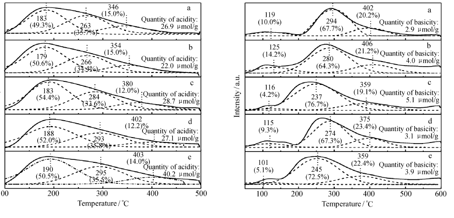 通过探针分子的吸附性能的NH3-TPD和CO2-TPD测试可以分别分析 wMgO/SBA-15催化剂表面酸性和碱性,结果如图5所示。 根据NH3(或CO2)的脱附峰所对应温度由低到高,可以将催化剂表面酸(或碱)性位的强度大致分类为:弱酸(或弱碱)位、中强酸(或中强碱)位和强酸(或强碱)位;通过分峰解析计算NH3(或CO2)脱附峰面积可以得出不同强度酸(或碱)性位的数量与比例。