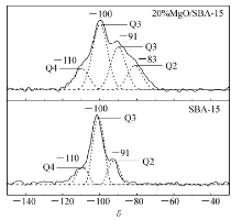 本文通过29Si-NMR表征分析催化剂样品中Si原子的化学环境考察MgO与载体SBA-15之间的强相互作用,如图4所示。 从图4中可以看出:SBA-15显示出3种典型无定形二氧化硅的化学位移,即-91、-100和-111,分别对应于(Si*(OSi)2(OH)2)、(Si*(OSi)3(OH))和(Si*(OSi)4)结构[9]。 而负载20%MgO后,催化剂样品在-83处出现一个新的肩峰,该峰可归属于(Si*(OMg)(OSi)2(OH))结构[5],表明在催化剂制备过程中载体SBA-15与活性组分MgO之间存在较强的相互作用,形成了Mg-O-Si结构。