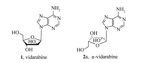 核苷碱基的阿拉伯糖苷具有广泛的生理和药理活性,如阿拉伯糖腺苷(vidarabine,9- β-D-阿拉伯呋喃糖基腺嘌呤)广泛用于治疗疱疹病毒、巨细胞病毒、乙型肝炎病毒引起的疾病以及急性白血病[1]。 从结构上来看,这些物质均为 β构型,其差向异构体 α-阿拉伯糖苷也是一类重要的活性物质。 如 α-阿拉伯糖腺苷(2a)是较好的抑制肿瘤细胞的先导药物(Scheme 1),具有和vidatabine类似的抗病毒活性[2]。 α-构型核苷的结构存在于维生素B12及其同族维生素中[3]。其独特的结构特点也产生了独特的生物学性质[4]。但迄今为止, α-阿拉伯糖苷一直作为合成 β构型的副产物,收率一般在5%以下[5]。 α-阿拉伯糖苷的单一构型合成并未引起合成工作者的关注。