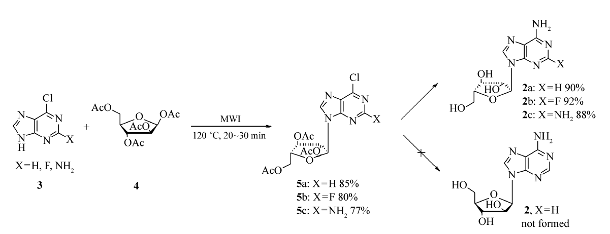 为了发展有效合成 α-腺嘌呤阿拉伯糖苷的方法,以1,2,3,5-四- O-乙酰基- β-D-阿拉伯糖和6-氯嘌呤为原料,在微波辐射和无溶剂、无催化剂条件下反应得到中间体9- α-D-(2',3',5'-三- O-乙酰基)阿拉伯呋喃糖基-6-氯嘌呤,收率85%。 该中间体物在Na2CO3催化下脱除乙酰基,然后“一锅”加入饱和的NH3/CH3OH溶液氨解,以90%的收率得到 α-腺嘌呤阿拉伯糖苷。 关键中间体9- α-D-(2 ',3 ',5 '-三 -O-乙酰基)阿拉伯呋喃糖基-6-氯嘌呤的合成反应规模可以扩大到100 g。 类似地合成 α-2-氟腺嘌呤阿拉伯糖苷和 α-2-氨基腺嘌呤阿拉伯糖苷。