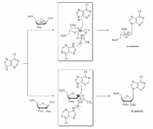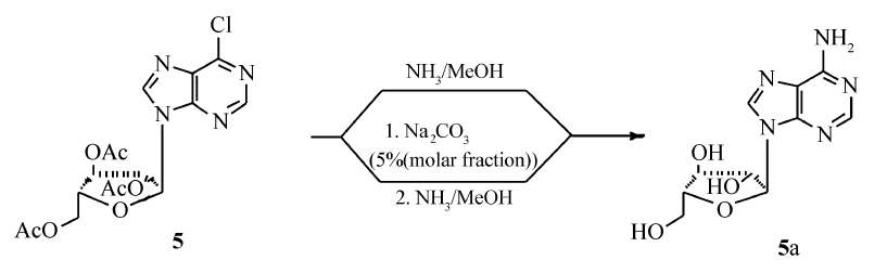 | tri-O-acetyl)-6-chloropurineside'> | Scheme 3 Deacetylation step of 9- α-D-(2',3',5'- tri-O-acetyl)-6-chloropurineside |
