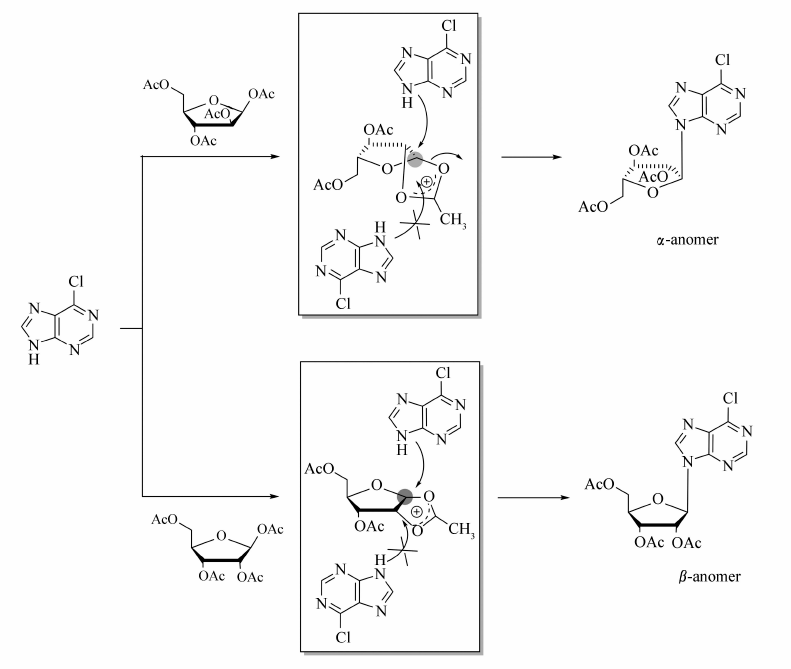得到的产品均是 α-构型,糖基1'位氢与2'位氢偶合常数 J≈4.0 Hz。因为1,2,3,5-四- O-乙酰基 -β-D-核糖与6-氯嘌呤缩合,得到的是单一的 β构型产物,而1,2,3,5-四- O-乙酰基- β-D-阿拉伯糖与6-氯嘌呤缩合,得到的是单一的 α构型产物。 因此,可能的反应机理是:1,2,3,5-四- O-乙酰基 -β-D-阿拉伯糖在加热后,生成环鎓离子,由于2位羟基的位阻效应,6-氯嘌呤单一性地从 α位进攻端头碳,得到 α-构型产物(Scheme 4)。 原料3中吸电子基团Cl或F原子对于缩合反应非常关键,带有给电子基团氨基或甲氧基等,反应不能发生。