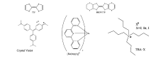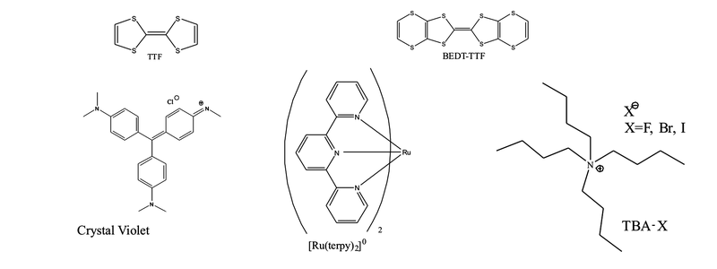 进行n型掺杂的有机掺杂剂种类较多,如一些低电离势的小分子有机物,如图10所示,如tetrathiafulvalene(TTF)和bis(ethylenedithio) tetrathiafulvalene(BEDT-TTF)可用于掺杂TCNQ[50,51],bis(terpyridine)ruthenium(II)([Ru(terpy)2]0)用于ZnPc等[52],有机盐类结晶紫罗兰(crystal violet)掺杂富勒烯[53],以及在结晶紫罗兰加氢后的氢化物(leuco-crystal violet)[54]。 除此之外,对一些有机物进行放射处理后,增强了分子活性,得到的阴离子也具有很强的n型掺杂能力,如通过溶液法,使用TBA-X(X=F,Br,I)对富勒烯进行n型掺杂[55]。