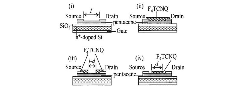 不仅可以使用金属盐类对沟道掺杂,还可以使用有机物进行掺杂。 Günther等[64]在研究垂直结构的并五苯OFET器件的接触掺杂时,分别进行了在电极下插入p型掺杂层C60F36,和共蒸并五苯与掺杂剂作为导电层,并对比了两种情况。 发现插入蒸镀层效果更好,掺杂密度更高,可以显著减小接触电阻,进而提高开态电流和开关比一个数量级以上。 根据实验的结果,他们提出了在垂直结构OFETs短沟道情况下,载流子主要在源极附近聚集,而非经典体系所认为的在有机/绝缘层界面富集,否则无法解释在接触掺杂后性能明显提升的结果。