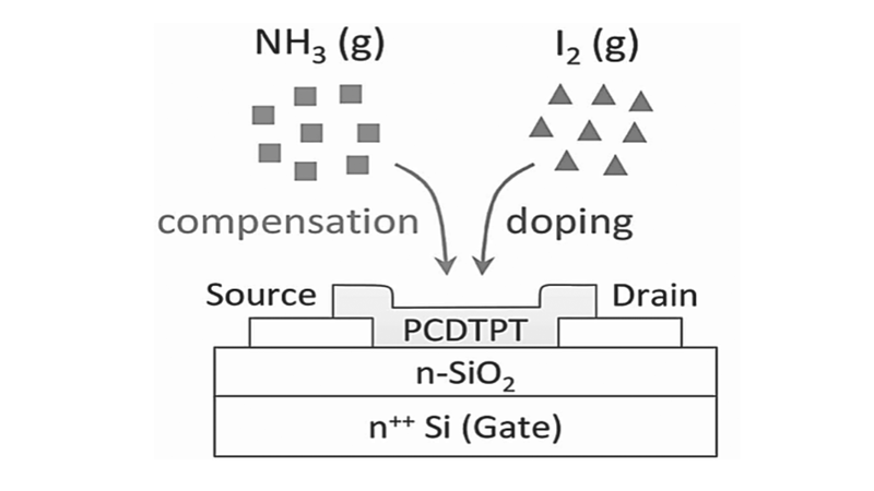 根据普遍被接受的掺杂理论,掺杂带来的载流子电荷会在载流子被栅极电压聚集之前就填进缺陷态,提高了载流子密度,因此可用于调节阈值电压,改善空气稳定性和提高器件的迁移率。 但是过度的掺杂会破坏高结晶相形貌,而有机薄膜的形貌对于器件的性能是至关重要的,薄膜的形貌被破坏时,器件开关比会下降。 如何平衡性能的提升与掺杂对于形貌的破坏,或者如何进行对形貌无损的掺杂,也是科研人员努力的方向。