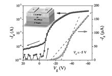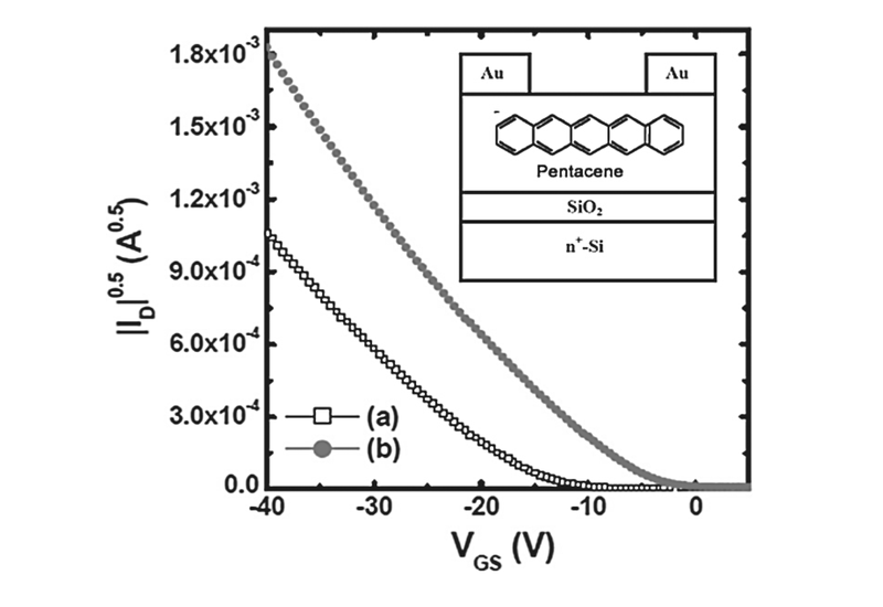 许多研究均在致力于解决这些问题,掺杂就是常见的一种方法来降低阈值电压。 通过掺杂作用提高有机层中载流子密度,提供更多可以移动的电荷,提高迁移率,但与此同时,在掺杂过量时,会带来对有机层结构的损伤,另外因为载流子密度提高,需要更大的栅极电压才可以完成对OFETs的控制,也就会导致开关比的下降和阈值电压的上升。
