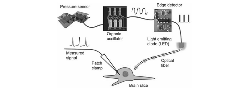 2015年,Tee等[12]实现了利用OFETs制备的有机振幅器,并且将其组装成了与人类皮肤原理相近的有机柔性电路,如图5所示,压力传感器收集到的微弱震动可以直接转化为电信号,做到及时、同步的响应,输出的频率为0~200 Hz,与神经元的反射频率相近,为大面积制备能够感知触感、并进行反馈的有机电子皮肤进行了有益尝试,这一研究在未来也可以用于假肢上。