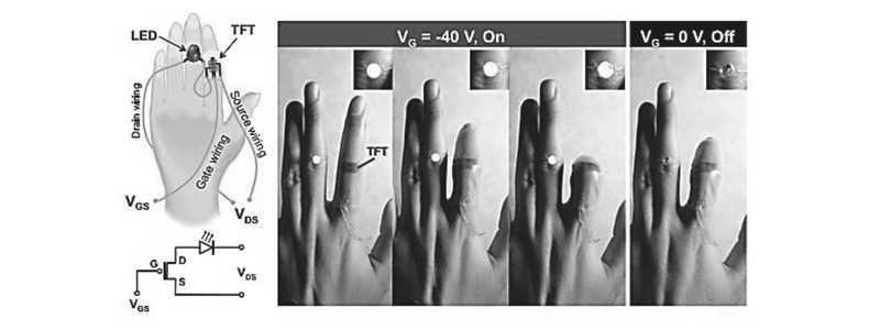 而此后的研究不再仅仅局限于用于机器人感知环境,更需要柔性器件处理由微弱的人体信号(如体温、心跳)转化而来的电信号。 人造皮肤需要对所接收的电信号有良好的控制、处理能力,需要更成熟的制造工艺来制备更大面积的器件阵列,与此同时又要兼顾亲肤舒适性。 随着器件性能的进一步提高,科研人员进一步扩展了基于OFETs的人造皮肤的边界。