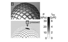 基于压力传感器的人造电子皮肤最初的设想是用于机器人感知周围环境,因此其需要具有如皮肤一般的敏感度,识别微弱信息的能力,这样的机器人才可以被用于复杂结构的现实环境中。 2003年,来自东京大学的Someya团队[11]实现了基于并五苯的OFETs用于大面积压力传感器的可能性,利用网状结构的压力橡胶,实现了25%的形变量。 其团队将此器件附着于已知形状及曲率的鸡蛋上,如图4所示,并且得到了压力信号,与此同时,基于类似的制备方式,还制造了探测温度的热传感器。 进一步得到了探测压力和温度的联合传感器,但其传感器的频率不高。
